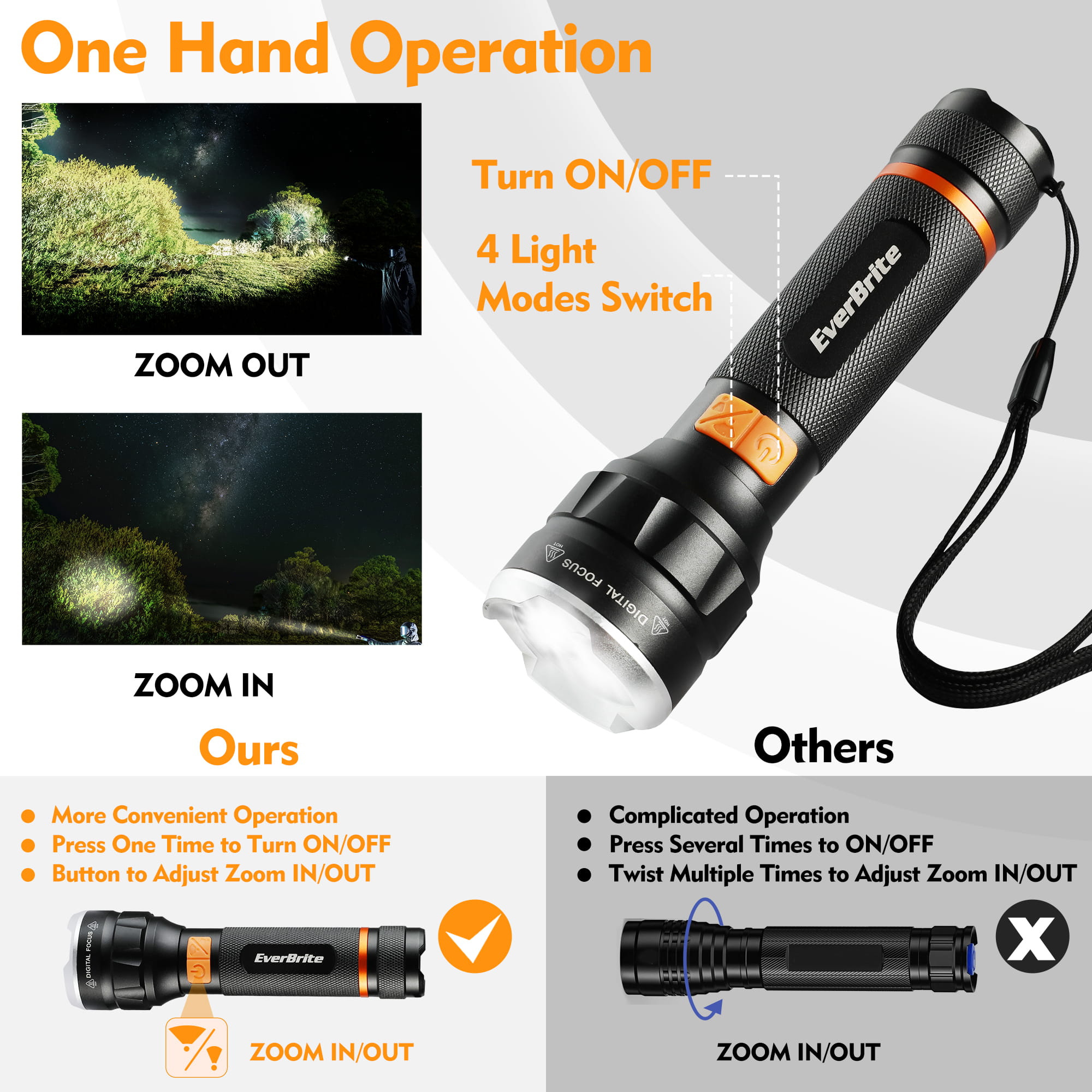 Unique Design: Features two buttons for on/off control and zoom in/out. Easy one-handed operation.
