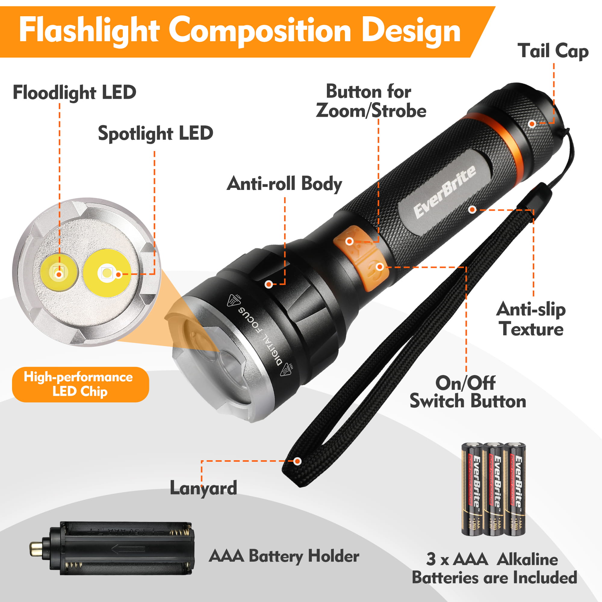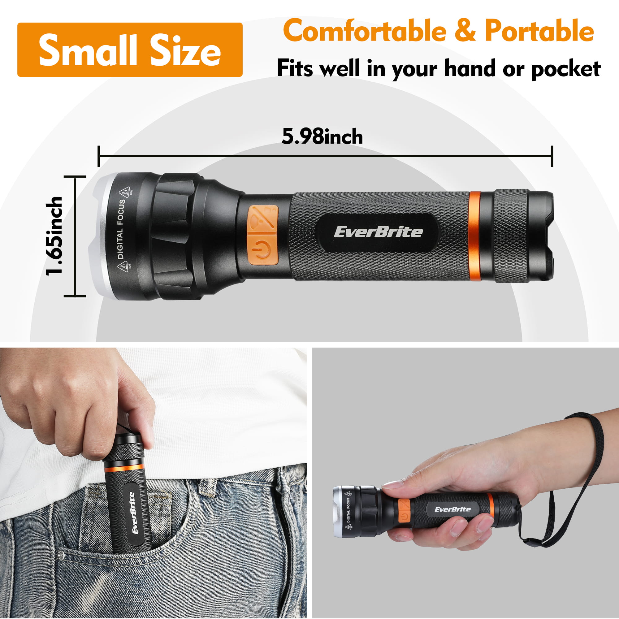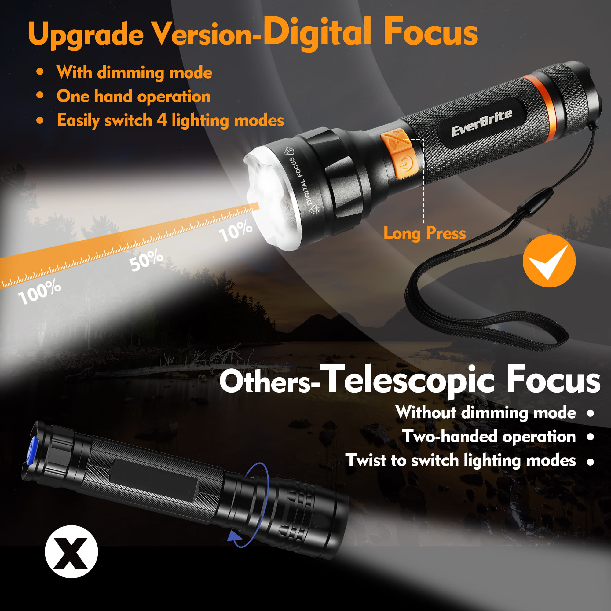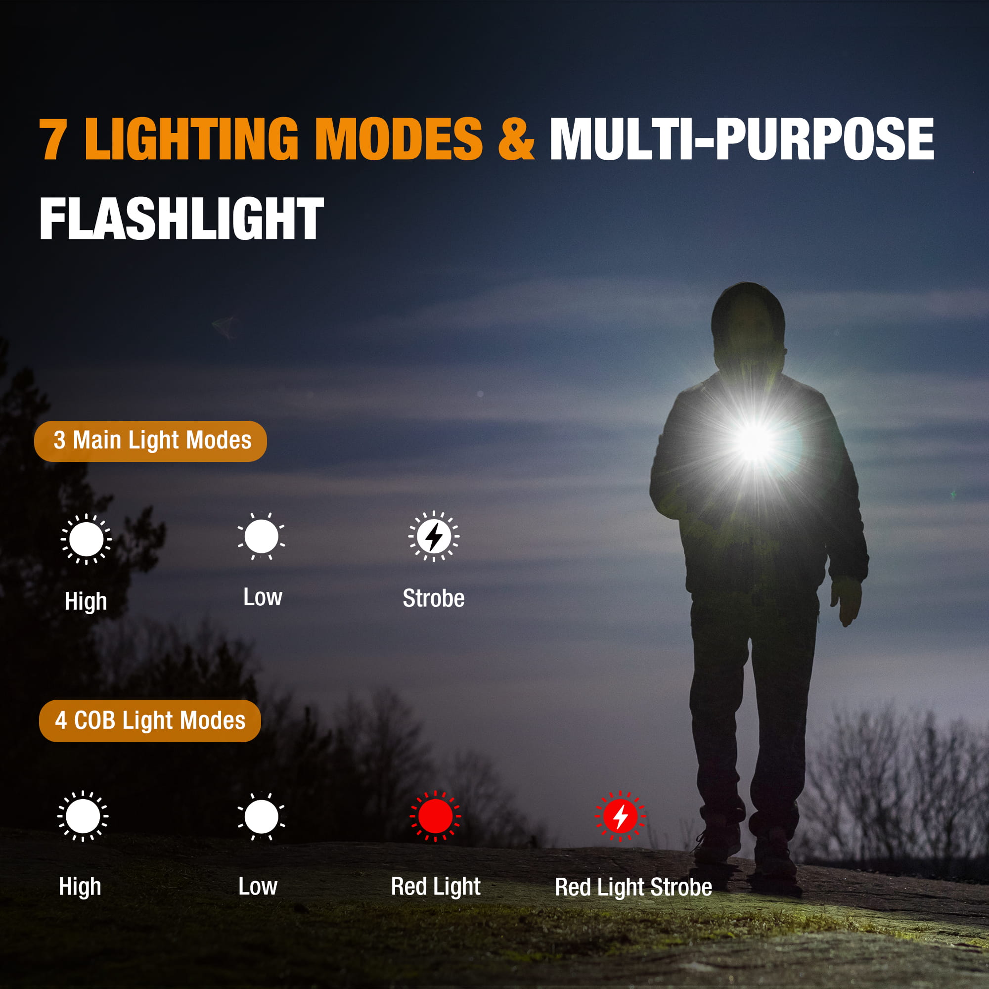 4 Lighting Modes with Digital Focus: Floodlight, Spotlight, Strobe, and Dimming for versatile lighting.