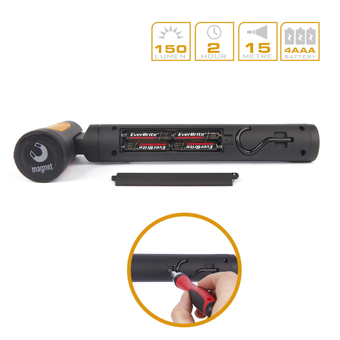 150 lm from a high-performance 3W COB LED with a top LED flashlight.