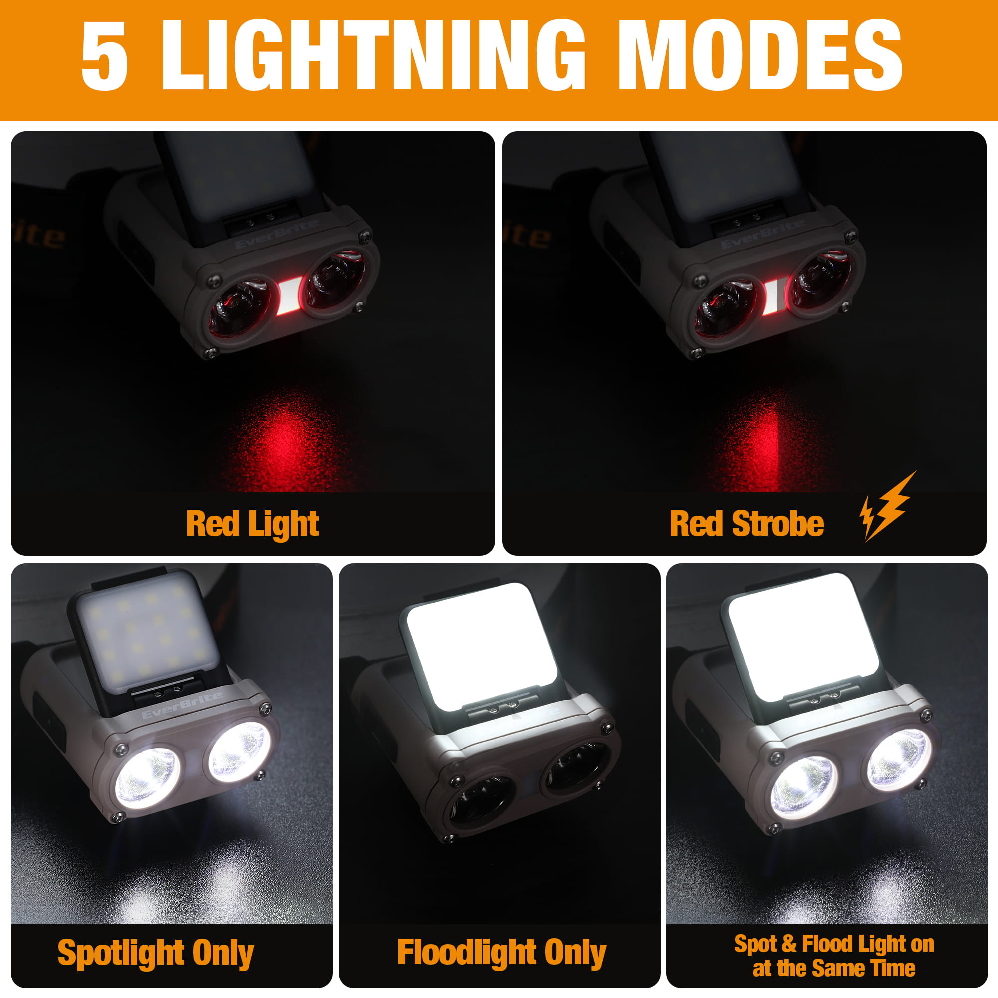 Multi 5 Light Modes: Spotlight only, floodlight only, spot & flood light on at the same time, red light only and SOS red strobe.