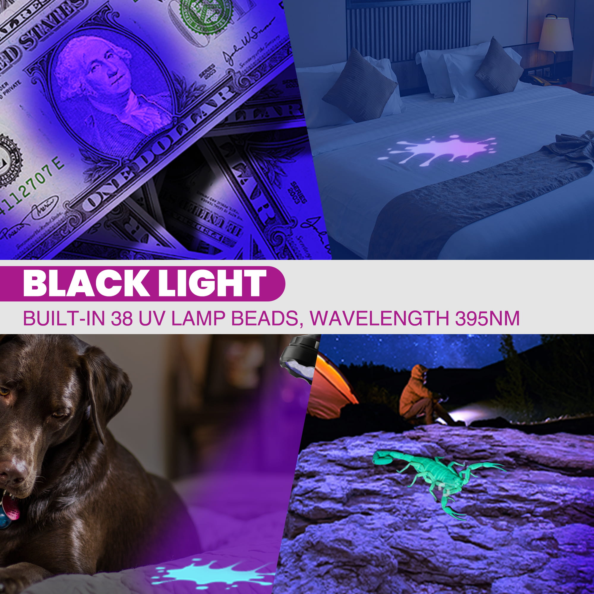 38 UV LEDs: 395 nm wavelength with up to 5 m range - perfect for pet stain detection, cleanliness checks, and more.