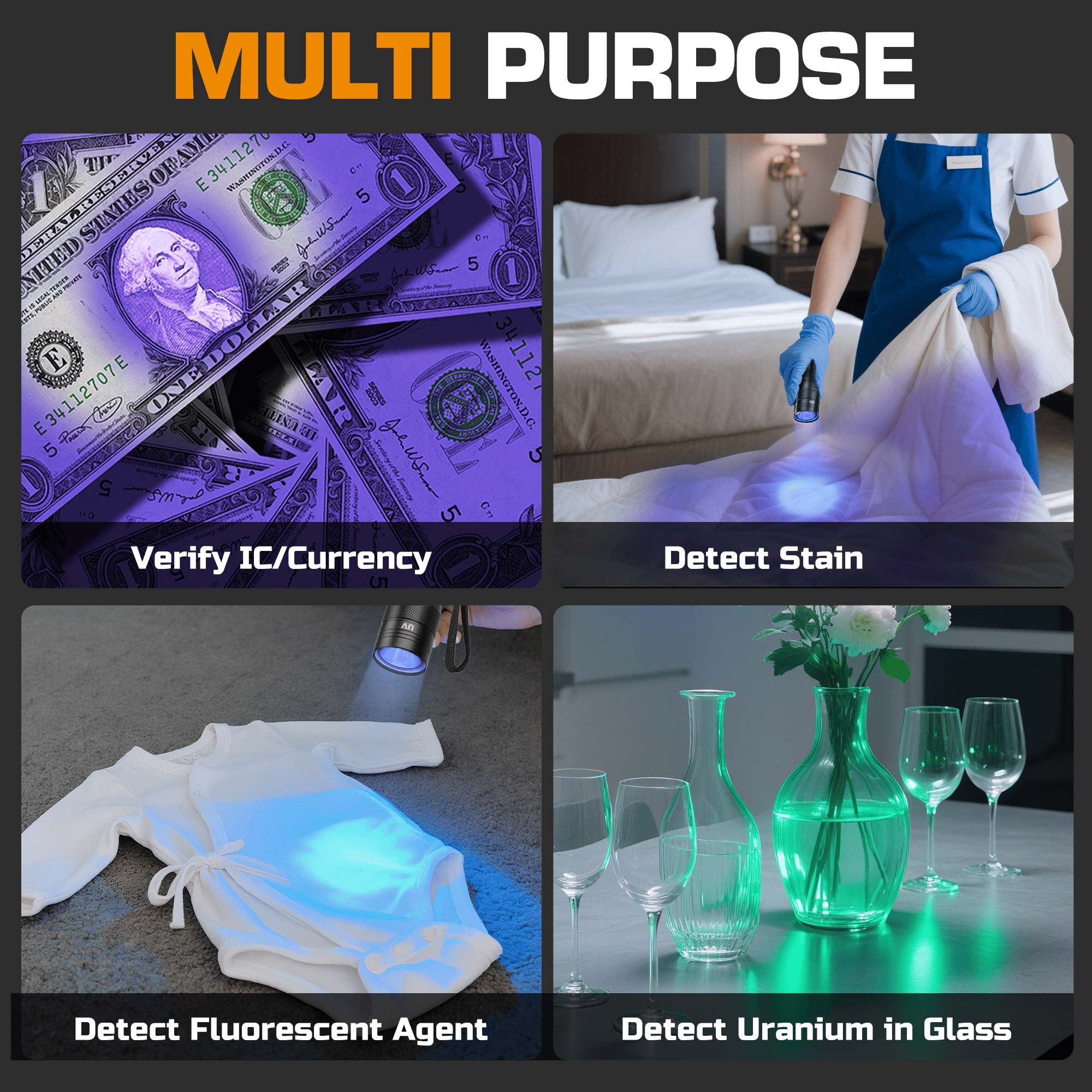 365 nm Professional UV Light: Detects pet stains, fluorescent agents, resin curing, hidden cracks, and more.